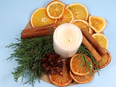 - Um die Kerze herum getrocknete Orangenscheiben (siehe nächster Schritt), frisch abgeschnittene Zweigspitzen und ebenfalls frisch zerbrochene Zimtstangen kleben (frisch, weil es dann stärker duftet).