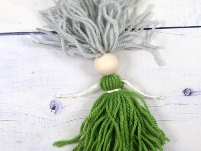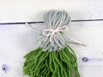 • Binde das Wollkleid an dem Kopf fest. Füge einen dickeren, etwa 12 cm langen Wollfaden in einer anderen Farbe als Arme mit ein.