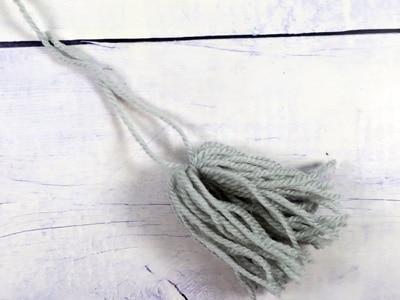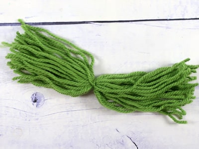 • Binde die Wollfäden mit einem längeren Wollfaden mittig zusammen. Mach einen Doppelknoten für den festeren Halt.
